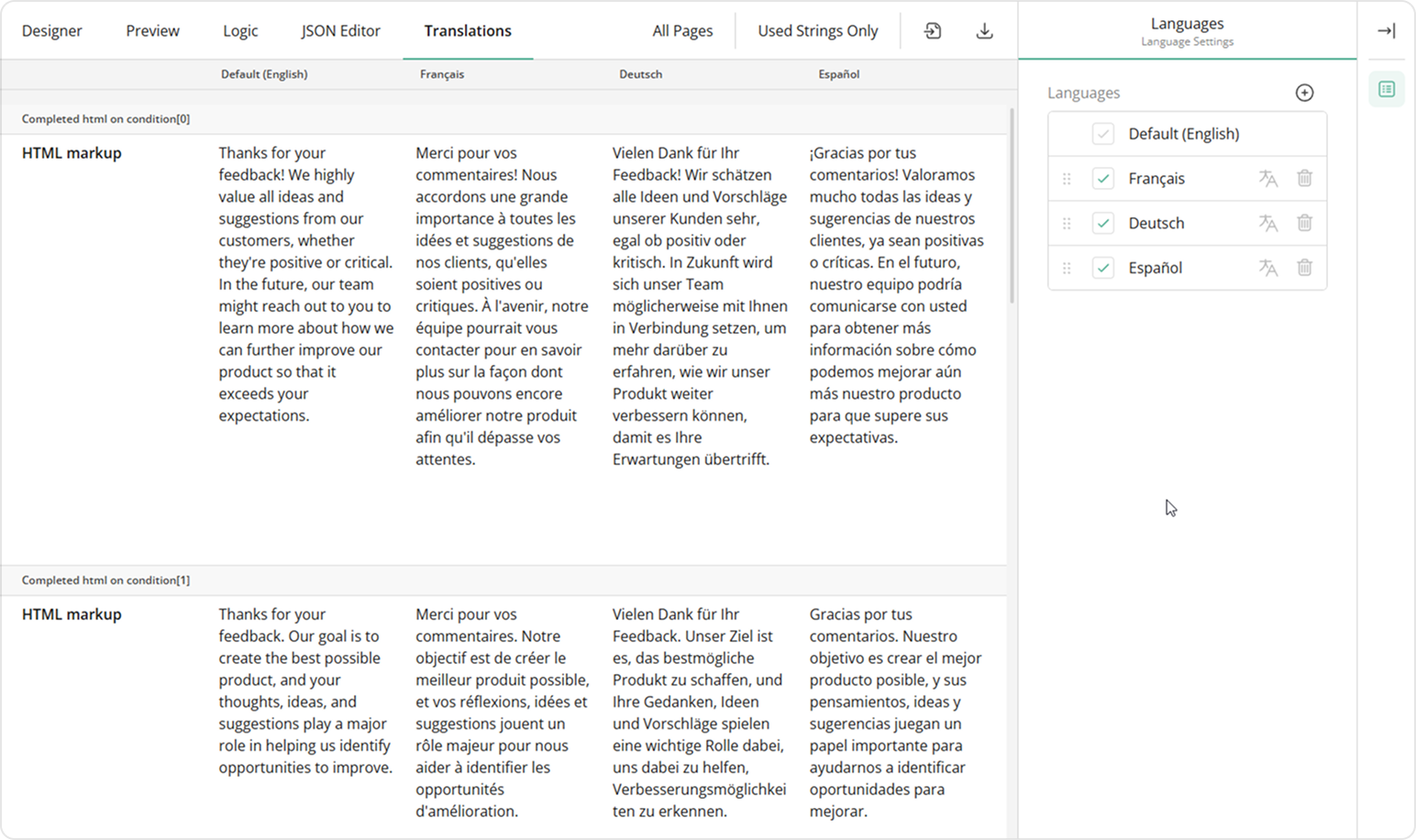 Yes. Survey Creator is translated into 30+ languages, including right-to-left ones. We include community-supported dictionary files, and if some strings are missing, they're automatically filled in with Microsoft's Azure AI Translator. You can also add your own dictionaries for languages we don't yet support. Each dictionary file includes a log of machine-translated strings so you can quickly spot them and replace them with your own translations. You can load all languages at once or only the ones you need, and you can set any language as the default. Please refer to this guide on how to localize the Survey Creator interface to learn more.